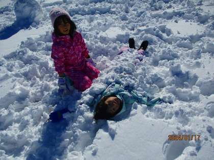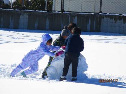 最高の天気の中、雪が積もったグラウンドでおもいっきり雪遊びをしました。