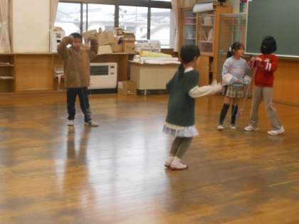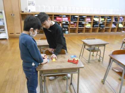 教室で折り紙や消しゴム等で遊ぶ子、生活科室で縄跳びをする子など、子供達同士で仲よく遊ぶ姿が見られます。