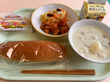 コッペパン、魚のアングレス、人参と豆のラぺ、鶏肉のフリカッセ、ショコラクレープ、牛乳 です。