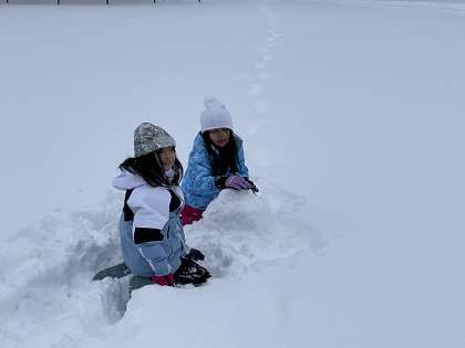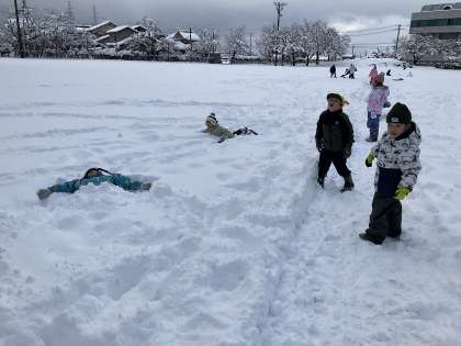 久しぶりに雪が積もったので、グラウンドで雪遊びをしました。