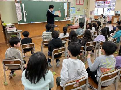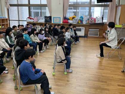 大沢野図書館から図書館司書の方をお招きし、「エパミナンダス」という話を聞いたり、「ほし」をテーマにしたいろいろな本の紹介をしていただいたりしました。どの話も子供たちは楽しそうに聞いていました。