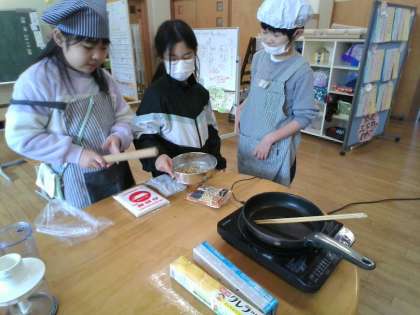 すみれ級で作りました。みんなで協力しながらしました。すみれ級の先生たちとも作りました。とても上手に作れました。美味しかったです。またみんなと作りたいです。楽しかったです。