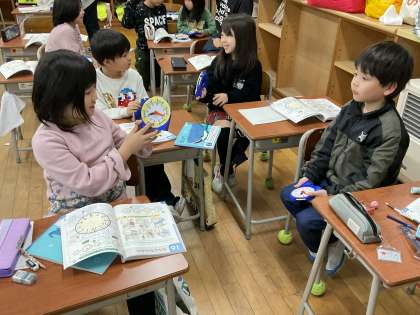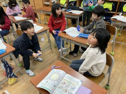 また、ペアになって問題を出し合い、時計の針を正しく合わせられるように練習しています。