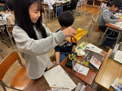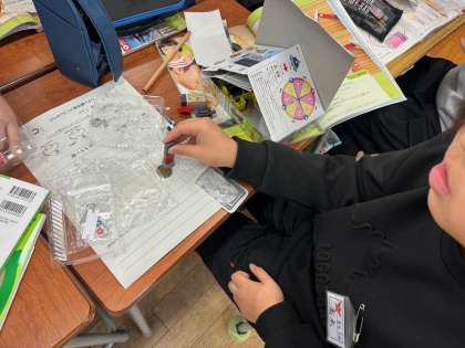理科「じしゃくにつけよう」の学習では、身の回りにある物の中でどのような物がじしゃくにつくのか調べました。子供たちは電気を通す物の実験結果から予想を立て、鉄がじしゃくに引きつけられることに気がつきました。