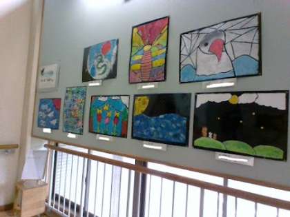 南階段や職員室前にも5年生のステンシル版画が飾ってあります。