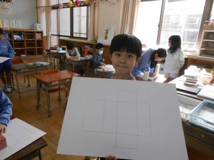 家から持ってきた箱の面の形や数を調べてから、自分の箱の面を画用紙に写しとりました。箱がずれないようにしっかりと押さえながら、ていねいに線を引きました。