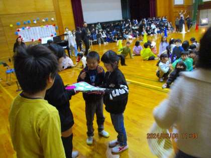 緊張していた1年生でしたが、発表を見て「6年生さんが笑ってくれた」と嬉しそうに話をしていました。発表後、突然泣き出す子供たちが続出。「6年生とのお別れが悲しい」「卒業してほしくない」と言っていた1年生。お祝いの会を通して、あらためて6年生の存在の大きさに気付かされました。