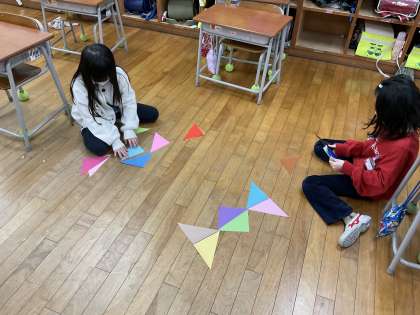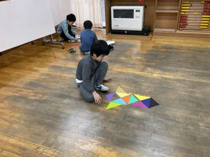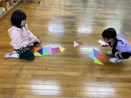 折り紙を使ってかたちづくり遊びをしています。つくってはバラし、いろいろな組み合わせを楽しんでいます。