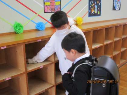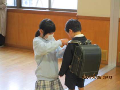 1年生の子供たちに名札をつけてあげたり、教室やロッカーの場所を教えてあげたり、優しい6年生の姿がたくさん見られました。