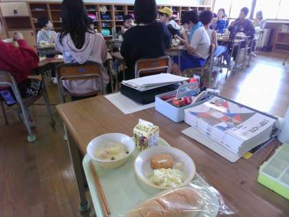 4月8日(月)6年生「今年度最初の給食」 公開日 2024/04/08 更新日 2024/04/08 6年生 学校の桜も満開です。今日は、給食開始日です。 今日のメニューはクリームシチューにコロッケ。 大好きなメニューの前にして、うれしそうに食べています。