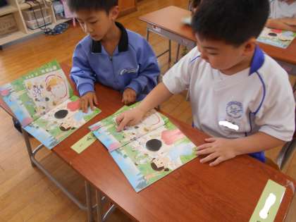 ジャンプをしているカエルに注目し、「紙飛行機に乗りたいんじゃない?」「紙飛行機を見ているんだよ」「紙飛行機に描かれているカエルを仲間だと思っているんじゃない?」と想像を膨らませていました。