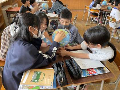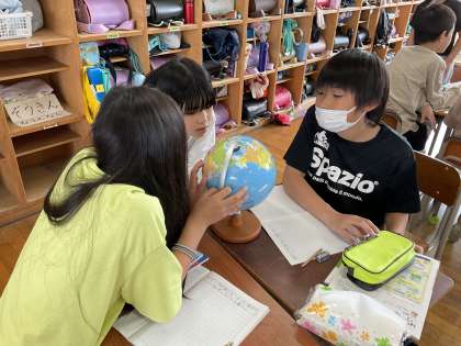 地図や地球儀を見て、気付いたことや不思議に思ったことをグループで話し合ったり、ノートに書いたりして学習を進めています。