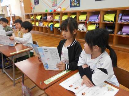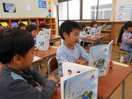 今日は、口の形に気をつけて「うたに あわせて あいうえお」を音読しました。