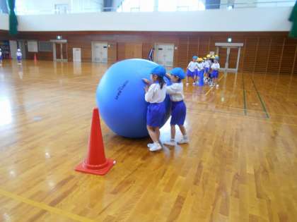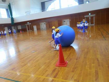 自分たちの背よりも大きい大玉に苦戦しつつも、ペアと協力して転がしていました。