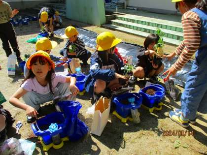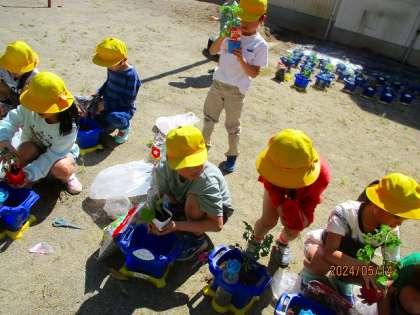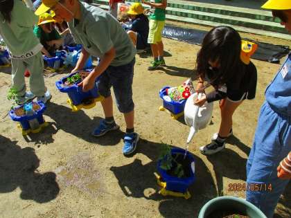 お家の人と相談したり、自分で決めたりして準備した野菜の苗を、鉢に植えました。色や形、友達とは違う自分の野菜の苗を、大切に大切に植えていた子供たちでした。この日のために苗や肥料の準備、アドバイス等、ご協力くださりありがとうございました。