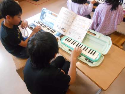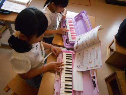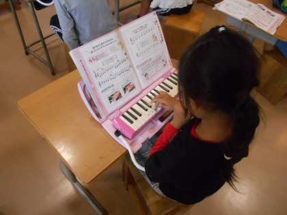 今日の音楽の様子です。ドレミ〜の音階や指くぐりを習いました。指くぐりは中指の下に親指を通らせて演奏する技法です。初めての子でも上手にできていました。