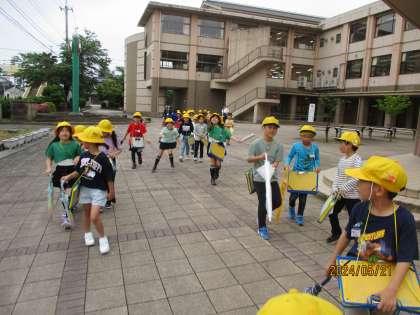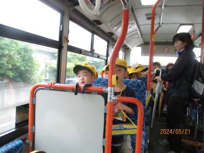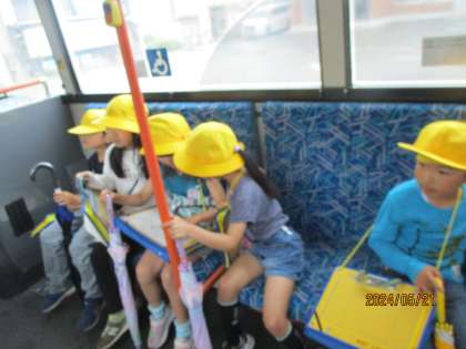 晴れの予報でした、小雨が降る中を公共のバスを利用して、野菜の苗を買いに行きました。初めて公共のバスを利用する子供も多く、地域の人と一緒にドキドキしながらバスに乗っている様子も見られました。