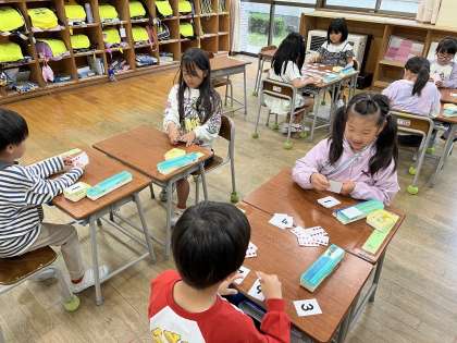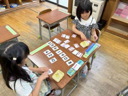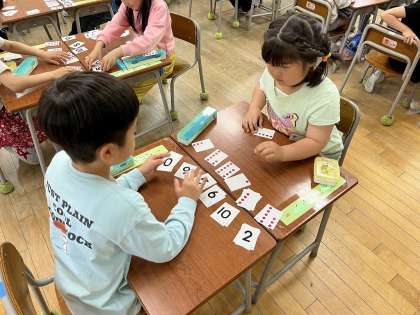 1〜10の数にもずいぶん慣れました。今日は、数カードを使って、ペアで数合わせゲームをしました。相手の出した数字や点数に合わせて、カードを出そうと、一生懸命頭と手を働かせていました。