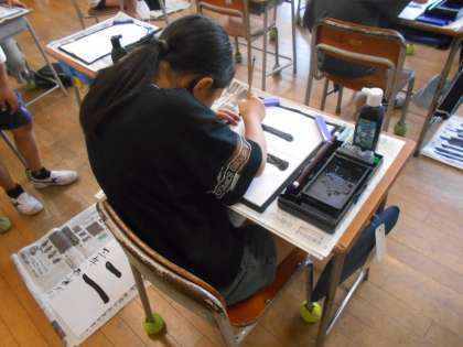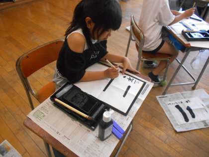 今日の書写の時間の様子です。このクラスは初めて筆で文字を書きました。書いたのは「二」です。筆の持ち方や線の太さなどを意識しながら練習していました。