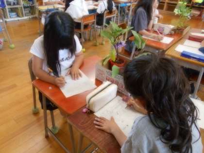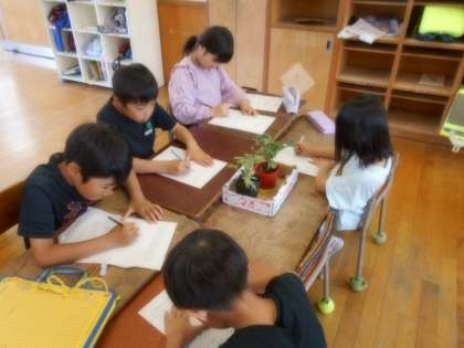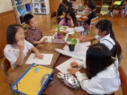 学校に帰ってきた子供たちは、早速苗の観察を行いました。
