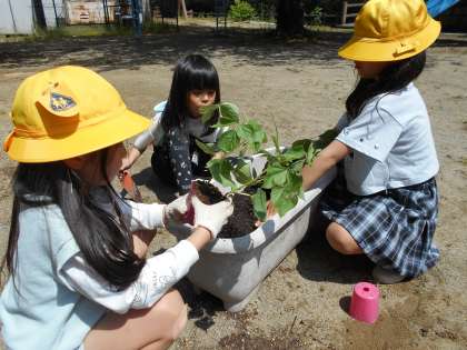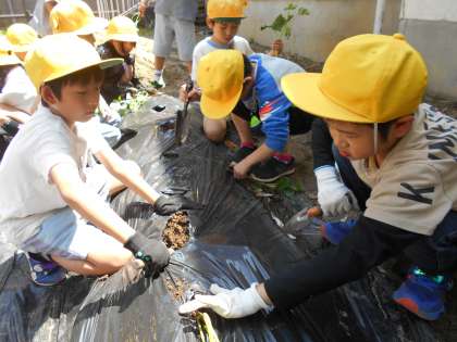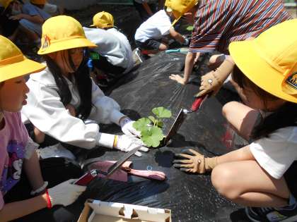 ジャガイモ、サツマイモ、スイカ、メロン、カボチャは畑に植え、ナス、ピーマン、つる豆はプランターに植えました。これからどのように育っていくか楽しみですね。すくすく育つようにお世話していきましょう。