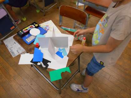 わりピンを使って回る仕組みを作り、自分が考えた世界を作っています。どのような世界が完成するか楽しみです。