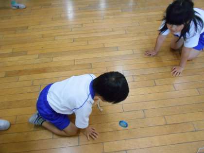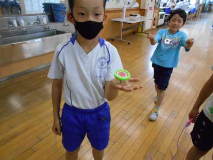 今日の休み時間の様子です。3年生ではこまがブームになっています。国語で「こまを楽しむ」を学習しているので、家から持ってきたこまを休み時間に回しています。手で回すことができる子もいました。