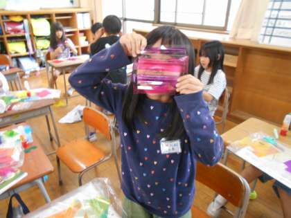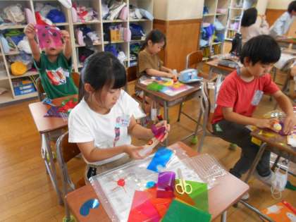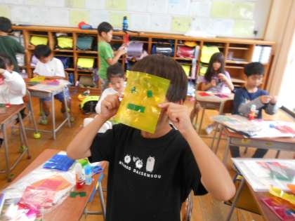 切り取ったセロハンを組み合わせて色の変化を楽しみながら作品をつくっています。何度も光を通して組み合わせを変えたりおもしろさを見つけたりしました。