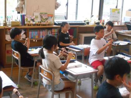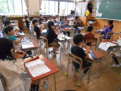 吹くときの姿勢や持ち方などに気をつけながら吹きました。明日は講師の方が来校され、リコーダーの吹き方などを詳しく教わる予定です。