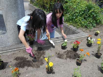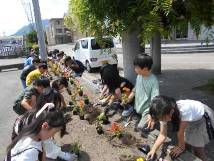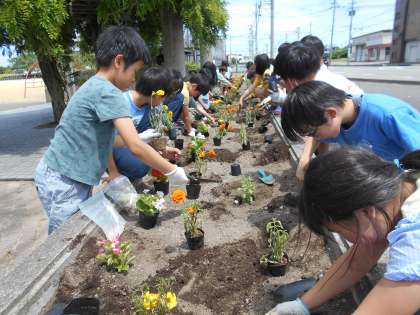 先日、飼育栽培委員会とグリーンキーパーさんと一緒に学校の花壇に花の苗を植えました。今日は、2年生の子供たちと一緒にバス停側の花壇に花を植えました。きれいに花が咲くといいなと願いながら丁寧に植えました。