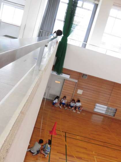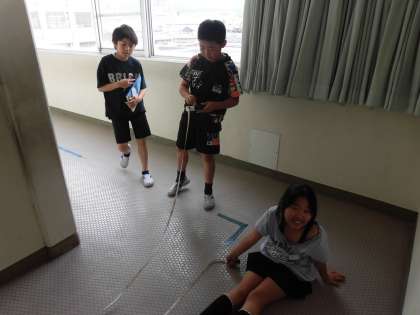 仲間と協力しながら、1階から2階までの高さ、廊下の長さを楽しそうに測っていました。