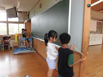 算数では、巻き尺を使った長さの測定について学習しています。今日はグループに分かれて、自分たちが測ってみたい長さを、巻き尺を使って測りました。