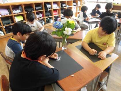 図画工作科では、「わたしのあじさい」に取り組んでいます。今日は、実物の紫陽花を見ながらスケッチし、その後画用紙に本番描きをしました。