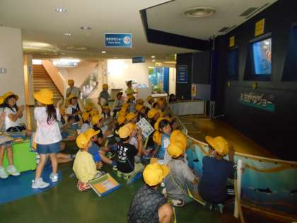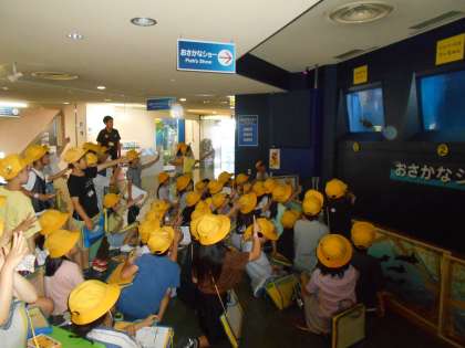 おさかなショーでは、ウマヅラハギのウーちゃんが輪っかをくぐったり、イシダイのイシちゃんが紙を引っ張ったりといろんな芸をしていました。子供たちは「すごい」と拍手していました。