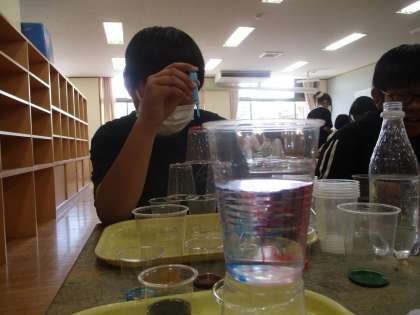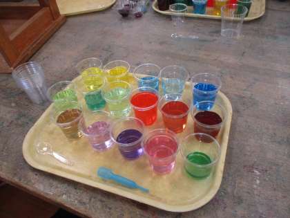今日は、その1回目の学習で、どんなことができるのか試しました。用意されたインクの色は、赤、青、黄、緑の4色。子供たちは、そのインクを薄めたり、合わせたりしながら様々な色をつくり、水に広がる色の美しさを楽しみました。