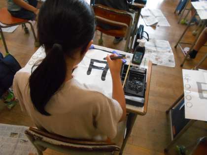 書写の時間では、「日」を書いています。「二」で横画を、「土」で縦画の書き方を学習してきました。「日」ではおれの書き方を練習しています。子供たちは一画一画丁寧に書いていました。