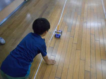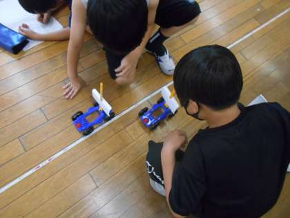 理科では、風で動く車の仕組みを使い、風の力と動いた距離の関係について調べています。送風機の風の強さを弱、中、強の3段階にし、車が動いた距離を測りました。どのような結果になったのでしょうか。