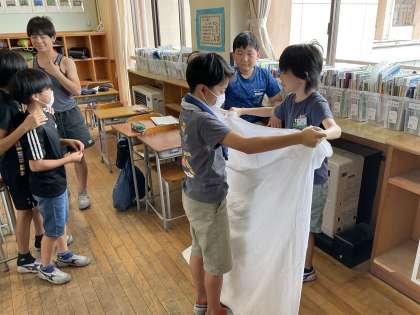 宿泊学習に向けて、準備を進めています。今日は、部屋ごとに分かれて、協力してシーツをたたむ練習をしました。
