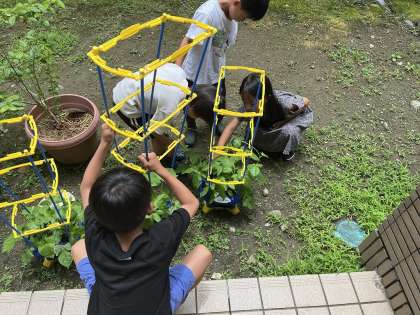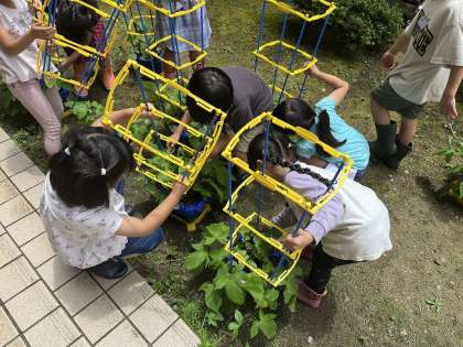 大きくなって、つるを伸ばしだしたアサガオのために、今日は支柱を立てました。葉やつるが支柱にひっかからないように注意して取り付けたり、横にそれているつるを引っ張って、支柱に軽く巻き付けようとしたりして、さらに大きく育つよう気を付けて活動していました。