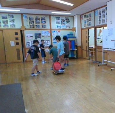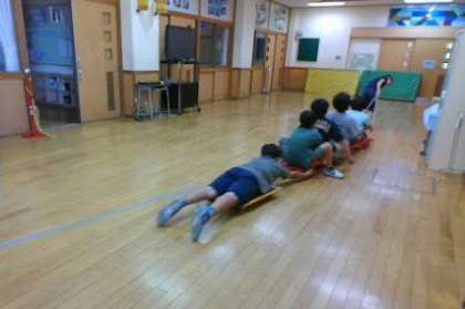 まずは、おにごっこ。キャスターボードに座ったり、腹ばいになったり、後ろ向きで進んだりと思い思いの乗り方で逃げました。