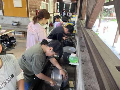 黒い煤がついた鍋を力強く磨く子、仲間の皿も含めてたくさんの皿を洗う子、使った道具をもっとキレイにして片付けるよう指導を受けたときに、進んでその仕事を手伝う子。