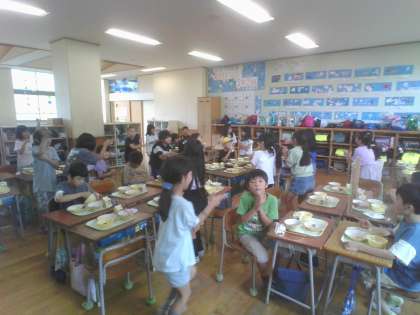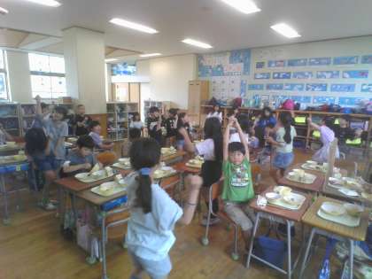 今日の給食では、スマイル音楽のコーナーがありました。リクエスト曲は、流行っている「カンカンダンス」の曲です。音楽が流れると、思わず体が動いてダンスする子供たちでした。