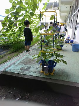 はっぱがざらざらしてたよ。つるがのびてたよ、うれしかった。つるがとなりの2ねんせいか3ねんせいのとまとにくっついててうれしかったよ。