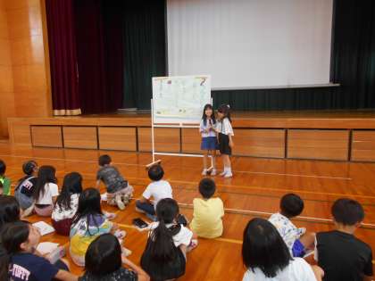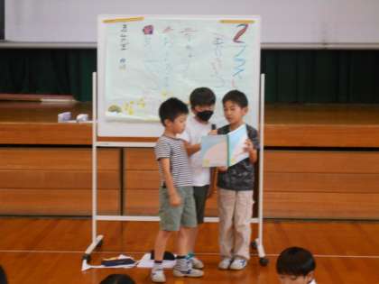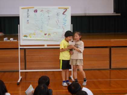 子供たち主催の学年集会を行いました。第1回目の企画は1組さんです。イベント係や工作係、イラスト係が今日のために準備していました。司会や言葉も責任をもって担当していましたよ。