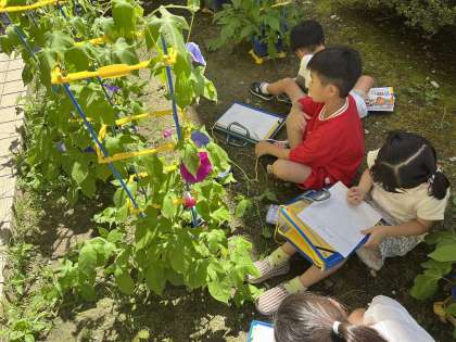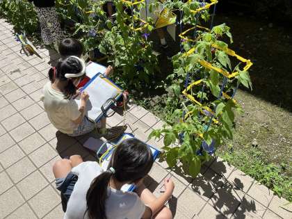 夏休み、それぞれの家に持ち帰るため、今日が1学期最後の観察です。ずいぶんつるが伸び、所々で花も咲き出しました。これからどんどん花が咲いていきます。自分で水やりなどのお世話を続けてほしいと思います。そして、また2学期、元気な鉢植えを持ってきてくれると嬉しいです。