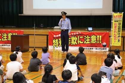 今日は警察の方に来ていただき、特殊詐欺についての話を聞きました。3年生からは、始めの言葉と終わりの言葉を4人の子供たちが話しました。集会の後、今日聞いたことをおじいちゃん・おばあちゃんやお父さん・お母さんや、地域の人に伝えるために手紙を書きました。特殊詐欺には気をつけないといけませんね。