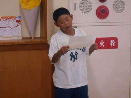 まず、各クラスの代表1名が1学期にがんばったことを発表しました。勉強や運動でがんんばっていましたね。その話を聞いて、自分はどう思ったかを聞くと、1学期にできなかったことを夏休みにがんばりたいと思っているようでした。