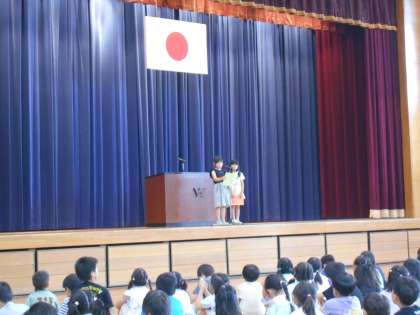 学年代表の子供や校長先生の話を聞きながら