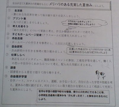 子供記者★ 7月29日(月)6年生 夏休み 公開日 2024/08/01 更新日 2024/08/01 子供記者のページ これは、夏休みの宿題です。 計画的に取り組みましょう。 6年生 H・A 学年の友達のコメント そうですね。私は今日でプリントが終わります!