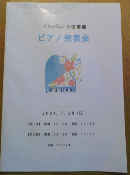 子供記者★8月6日(火) 4年生 「ピアノ発表会」 公開日 2024/08/06 更新日 2024/08/06 子供記者のページ 私のピアノ教室のピアノ発表会のプログラムです。 ピアノが上手に弾けて嬉しかったです。 子供HP記者 4年1組 H.S